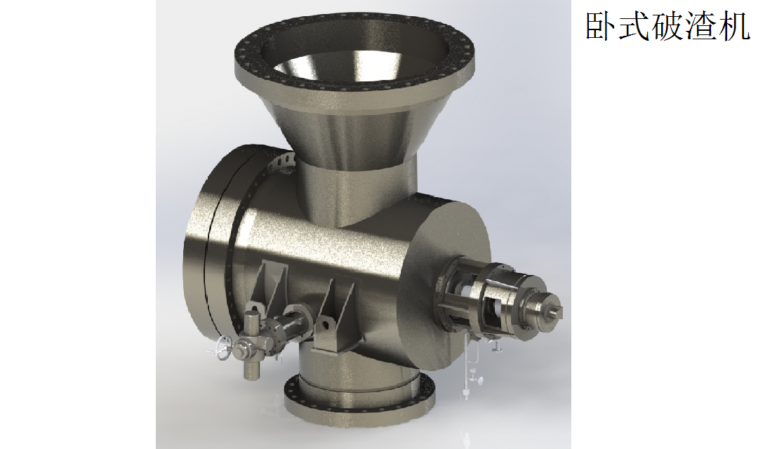破渣機(jī)殼體為壓力容器,其核心部件動齒和靜齒偏心地安裝在殼體上,二者做相對運動,不斷將爐渣等固體進(jìn)行旋轉(zhuǎn)破碎。在動齒與靜齒的上方設(shè)有導(dǎo)流板,以保證所有物料通過破碎系統(tǒng)并防止未破碎物聚集在動齒上方,同時配置液壓及電控系統(tǒng),可以實現(xiàn)破碎系統(tǒng)的日常運行、監(jiān)控、報警等多項功能。